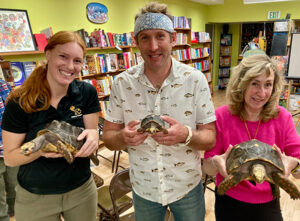 From Publisher’s Weekly: A Tortoise Meet and Greet. Fact & Fiction bookstore in Missoula, Mont., gave collaborators Sy Montgomery (r.) and Matt Patterson (c.) a warm welcome on September 10 for the launch of their new picture book, The True and Lucky Life of a Turtle (Clarion). The picture book follows the life of a lucky turtle who must rely on his friends when he faces his first bout of trouble. Nonprofit Animal Wonders, which offers educational outreach programs, brought red-footed tortoises Bubbles, Tubby, and Yuka to meet readers at the event.